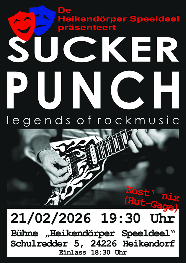 Die Band „Sucker Punch“ tritt am 21. Februar in der Heikendörper Speeldeel auf. Die Playlist liest sich wie aus einem Lexikon epischer Rock-Songs. Der Eintritt an diesem Abend ist frei, Spenden werden gerne angenommen. Die Speeldeel sorgt mit ihrem Getränkeverkauf dafür, dass die Kehlen beim Mitsingen nicht trocken werden. Beginn ist um 19:30 Uhr, die Türen öffnen wir bereits ab 18:30 Uhr.